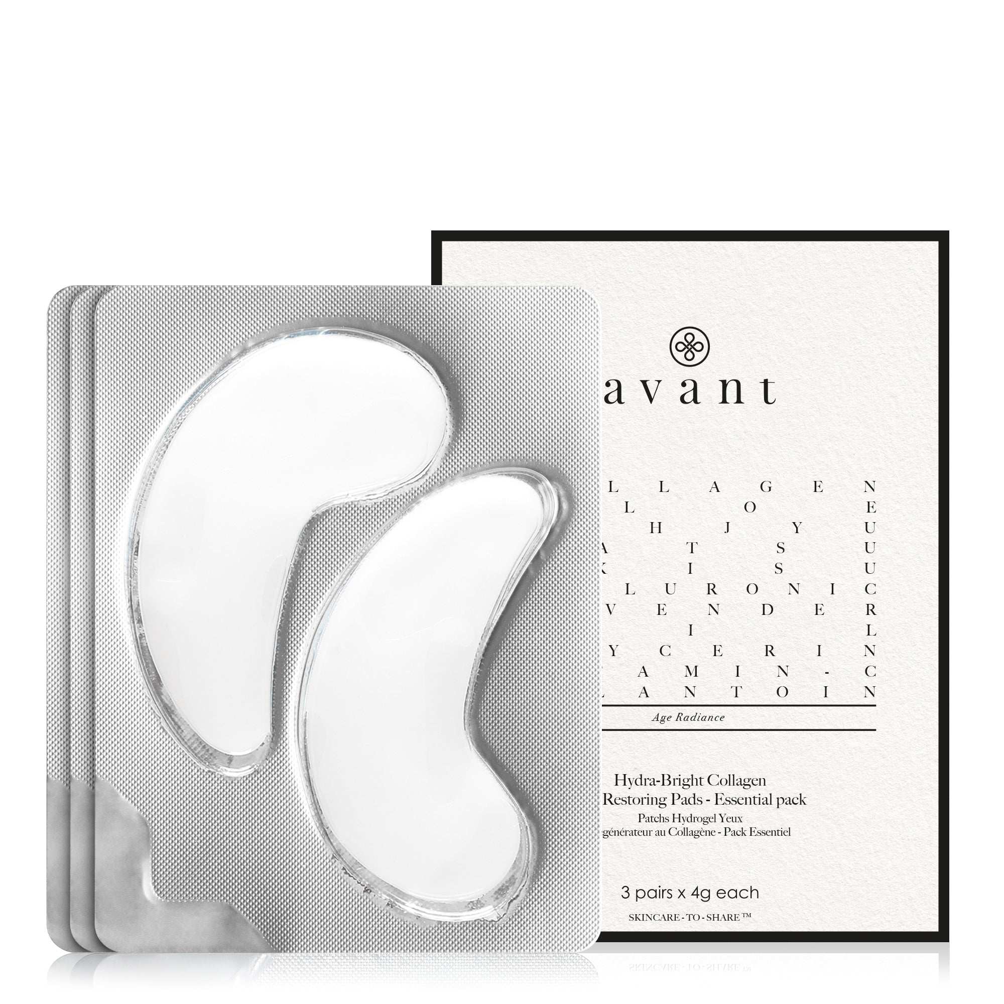 The Hydra-Bright Collagen Eye Restoring Pads are infused with Collagen, Hyaluronic Acid, and Aloe Vera.